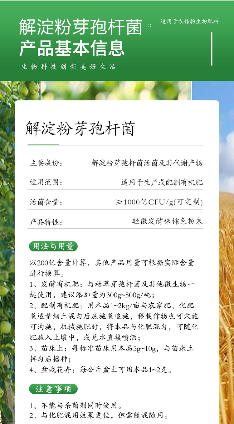 【主要成分】:解淀粉芽孢桿菌活菌及其代謝產(chǎn)物。載體:淀粉。