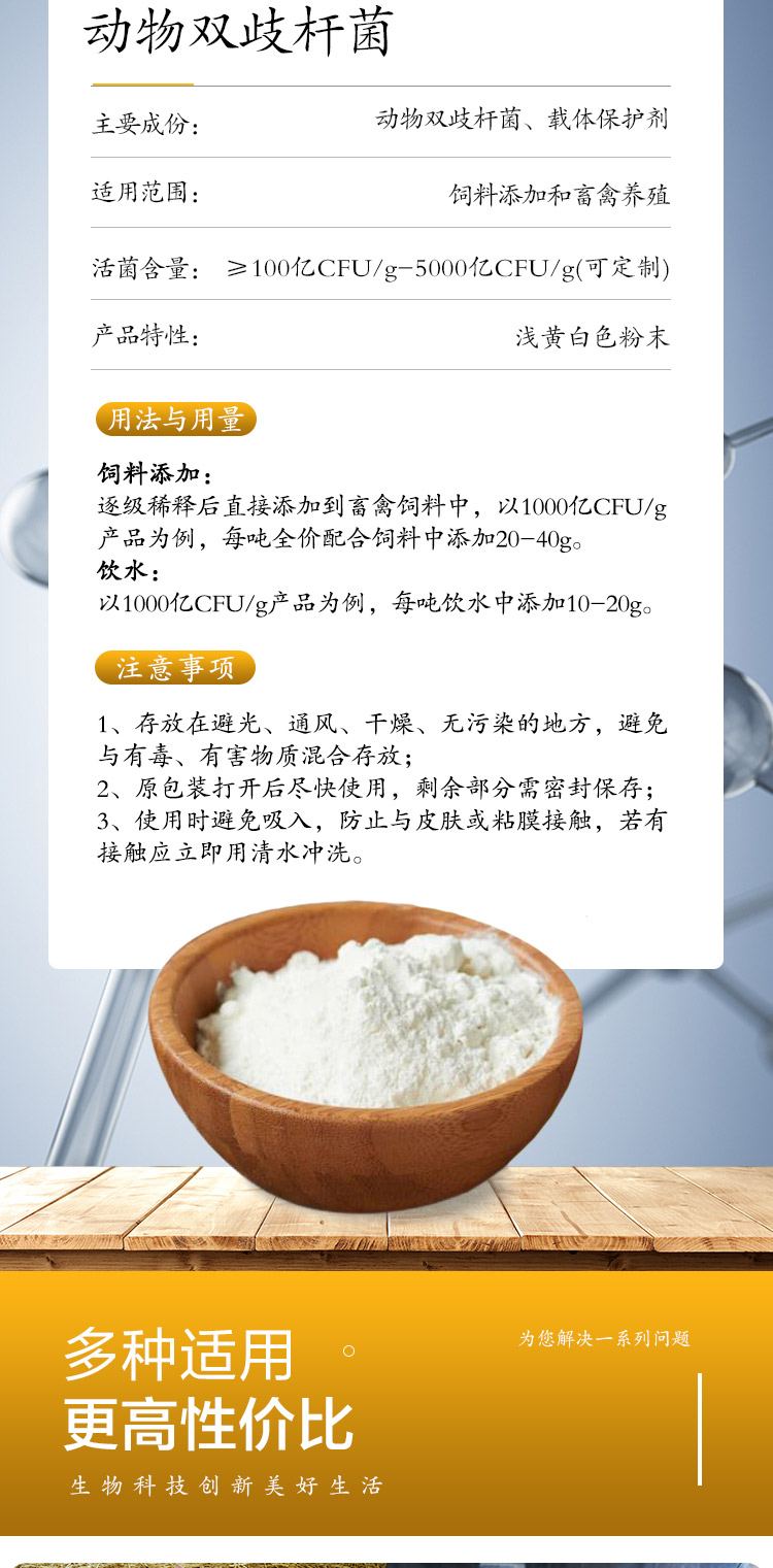 飼料添加:逐級稀釋后直接添加到畜禽飼料中,以1000億CFU/g產(chǎn)品為例,每噸全價配合飼料中添加20-40g。